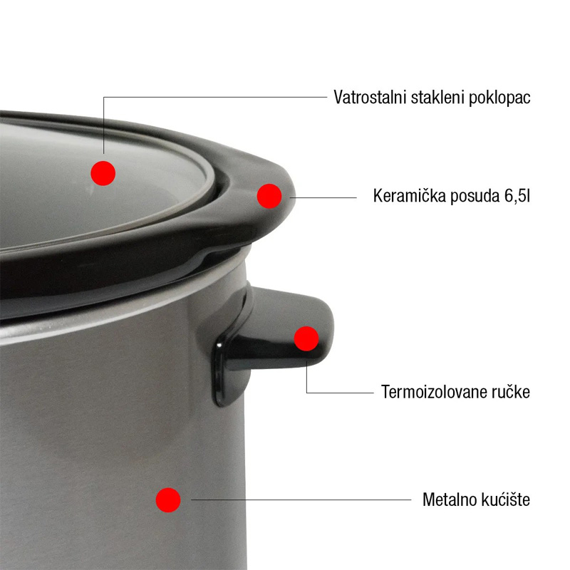 Sve ostale najbolje karakteristike nasledio je od svojih mehaničkih rođaka – izdržljivu keramičku posudu zapremine 6,5 litara, stakleni poklopac kroz koji možete pratiti pripremu jela, i naravno kuvanje dugim sporim krčkanjem na nižoj temperaturi koje izvlači sve najbolje iz namirnica i čini Vaša jela slasnim i ukusnim!
